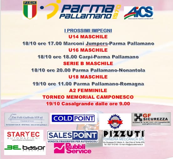 Gli impegni del Weekend18/10/2025/in News A2 Femminile, News giovanili, News squadra senior, News Under 14 maschile, News Under 16 maschile, News Under 18 maschile /da parmapallamanoasd https://parmapallamanoasd.it/wp-content/uploads/2025/10/Sponsor_18-10-25.jpg 158 549 parmapallamanoasd https://parmapallamanoasd.it/wp-content/uploads/2021/11/parma-pallamano-logo.png parmapallamanoasd2025-10-18 09:01:042025-10-18 09:01:04Gli impegni del Weekend