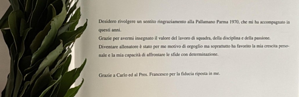 ha inserito una dedica a Parma Pallamano, al nostro Professore Carlo Bertolucci e al Presidente Francesco Fanti.